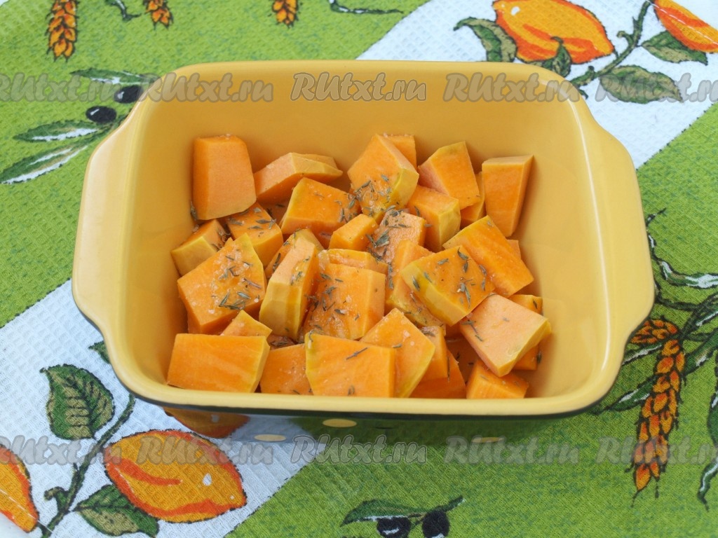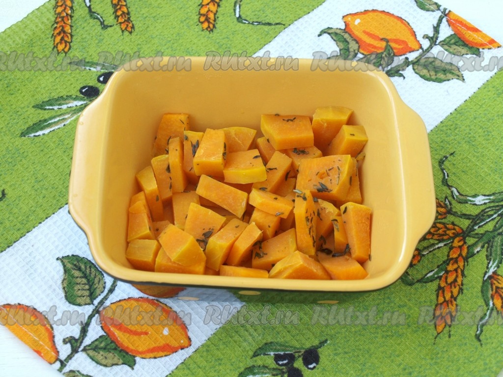 Тыкву следует очистить от кожуры и нарезать пластинками толщиной 5 мм. Подходящую формочку для запекания смазать оливковым маслом, выложить тыкву, посыпать тимьяном и солью по вкусу, сбрызнуть столовой ложкой оливкового масла.