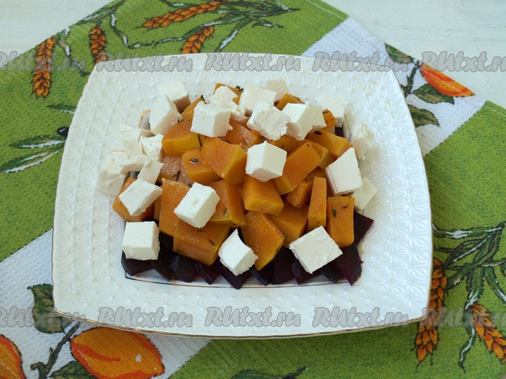 Далее выложить запечённую тыкву и нарезанную кубиками фету.