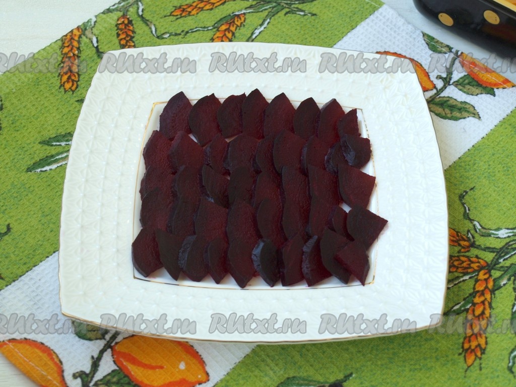 Свеклу остудить, очистить и нарезать ломтиками. Внахлёст выложить свеклу на тарелку.