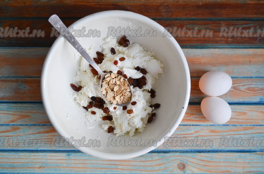 Творог протереть через мелкое сито или с помощью блендера. В сравнении с не протертым (зернистым) творогом, протёртый творог приобретает однородную и очень нежную консистенцию. Добавить к протертому творогу горсть изюма (его необходимо заранее промыть, на 5-7 минут залить кипятком, а затем обсушить), 2 столовые ложки овсяных хлопьев быстрого приготовления и куриные яйца.