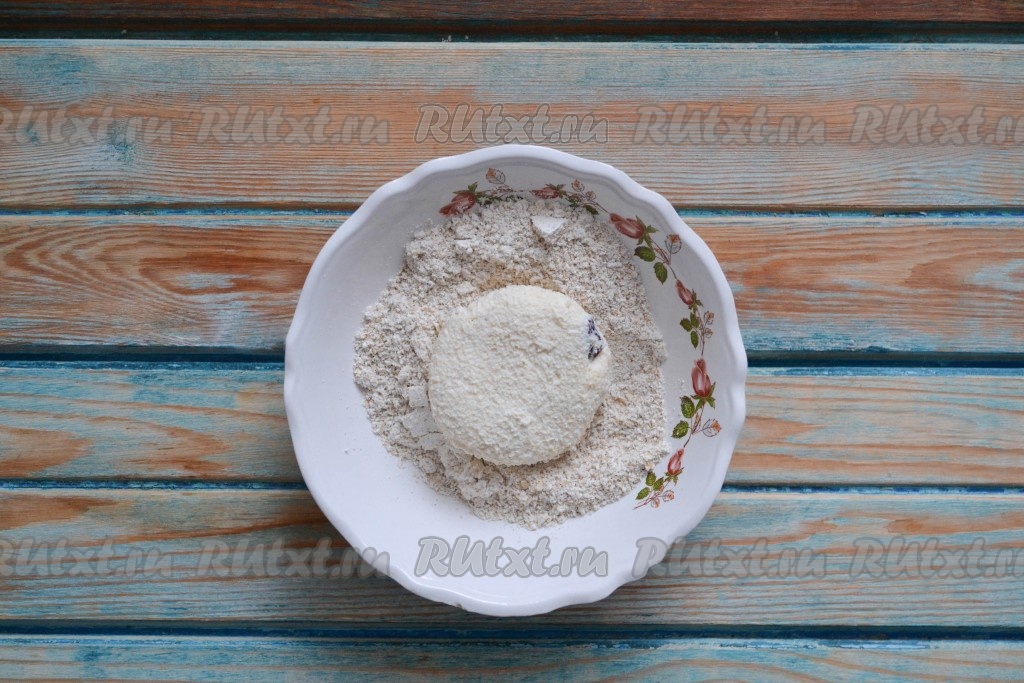 Отделить часть теста желаемого размера, придать форму шара, а затем немножко приплюснуть. Обвалять заготовки в овсяных хлопьях. Для удобства, я перемолола овсяные хлопья кофемолкой, но если вы используете мелкие хлопья - это делать необязательно.