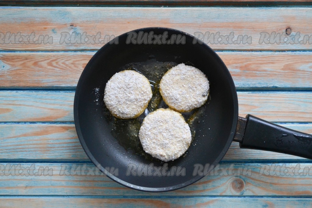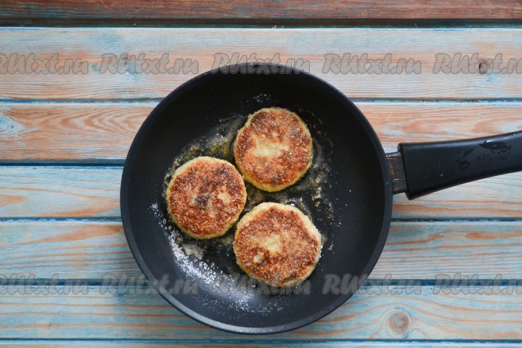 Разогреть сковороду и влить в нее 1 столовую ложку растительного масла. Через минуту сделать огонь ниже среднего и выложить сырники. Крышкой не накрывать.