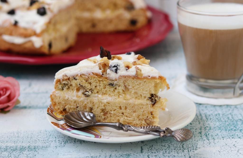 Готовый бисквитный пирог остудить. Самый простой способ подачи - просто посыпать пирог сахарной пудрой. Я же захотела сделать что-то вроде торта, поэтому взбила 200 грамм сливок жирностью 33% и 80 грамм сахара, разрезала пирог на 2 коржа, смазала нижний корж взбитыми сливками, затем выложила верхний корж, оставшиеся сливки намазала сверху пирога и посыпала грецкими орехами и черносливом, оставила его на пару часов пропитаться и подала на стол.
