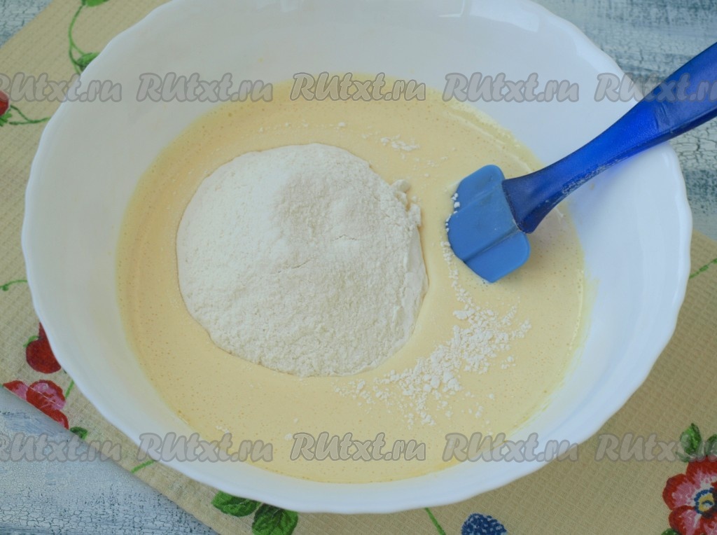 Муку смешать с разрыхлителем и просеять в получившееся тесто, перемешать лопаткой складывающими движениями снизу вверх.