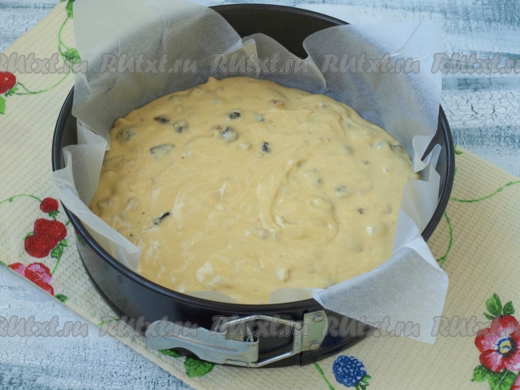 Нарубить очищенные грецкие орехи и нарезать кусочками чернослив, добавить их в тесто и перемешать. Тесто получится густым.