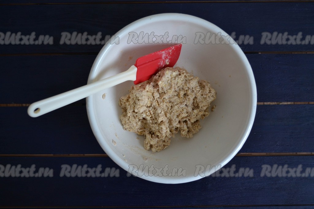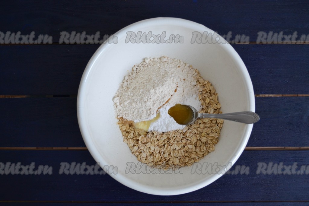 В глубокой миске соединить цельнозерновую муку и овсяные хлопья.