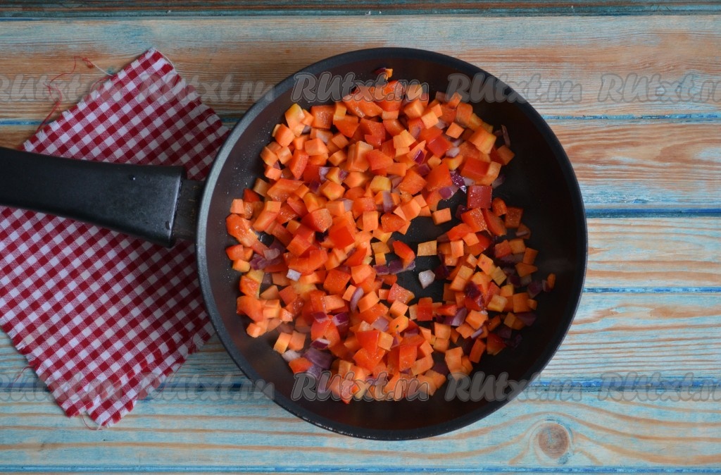 В сковороду влить растительное масло, выложить нарезанные морковку, сладкий перец и лук, обжарить на слабом огне 3-4 минуты, периодически помешивая.