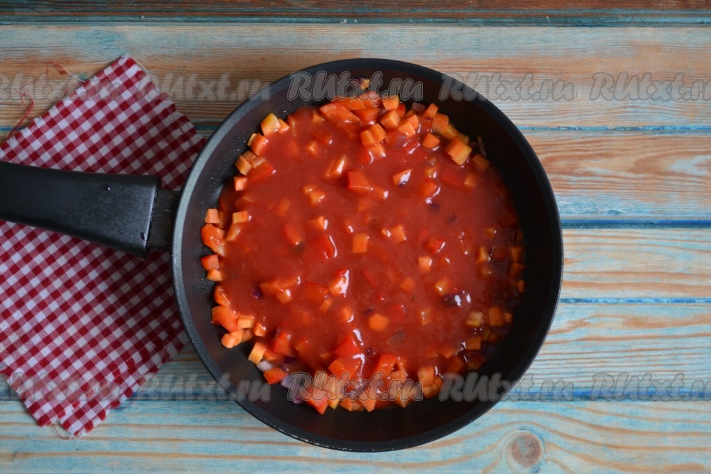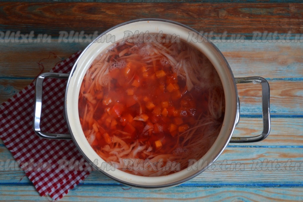 К обжаренным овощам влить томатный сок и продолжить приготовление овощной заправки еще 5-7 минут на небольшом огне. За это время должна выпариться жидкость.