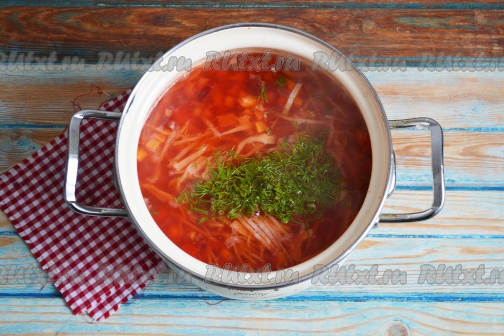 Выложить овощную заправку в кастрюлю и продолжить варить постный борщ на маленьком огне еще 15-20 минут.