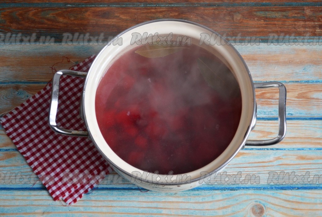 В кипящую воду выложить нарезанные картошку и свеклу, лавровые листики, довести до кипения, уменьшить огонь и варить 15-20 минут.
