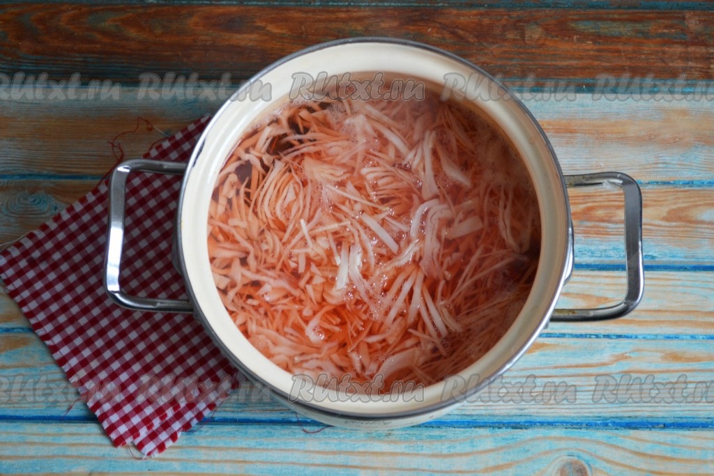 По истечении 15-20 минут выложить в кастрюлю капусту и продолжить варить на маленьком огне 5-7 минут.