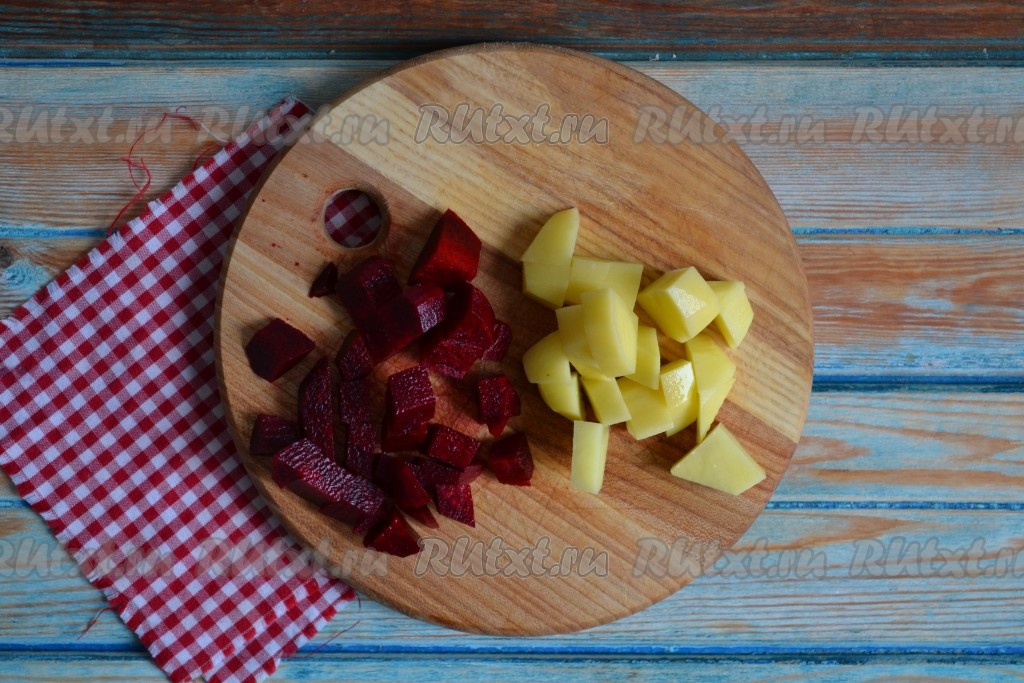 Очистить и нарезать небольшими кусочками свеклу и картофель.