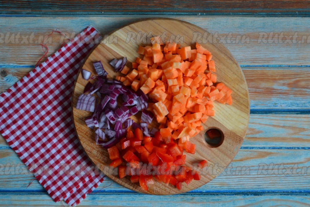 Очищенные лук и морковь, а также сладкий перец, освобожденный от семян, нарезать мелкими кубиками.