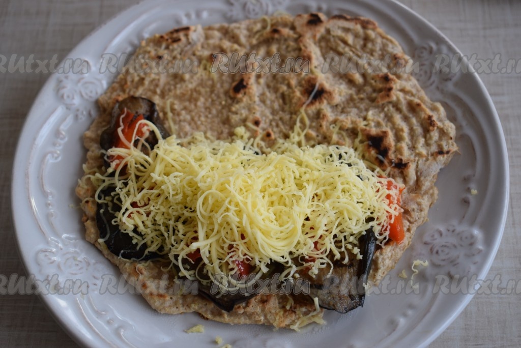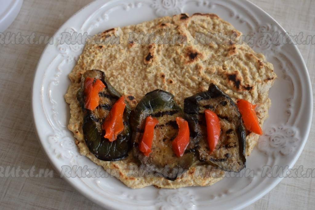 Для приготовления начинки баклажан нарезаем на кружочки, берем полоску болгарского перца, солим, перчим, добавляем специи к овощам, обжариваем овощи на сковороде гриль, слегка смазав ее растительным маслом (можно обжарить овощи без масла, я выбрала именно такой вариант). Далее выкладываем овощи на половину овсяноблина.