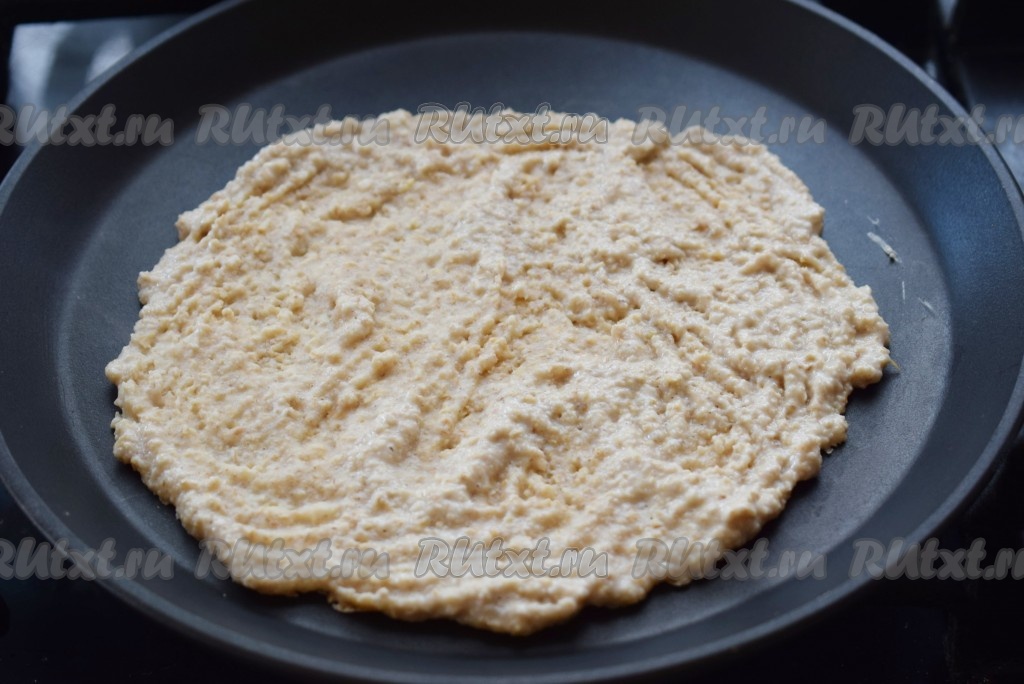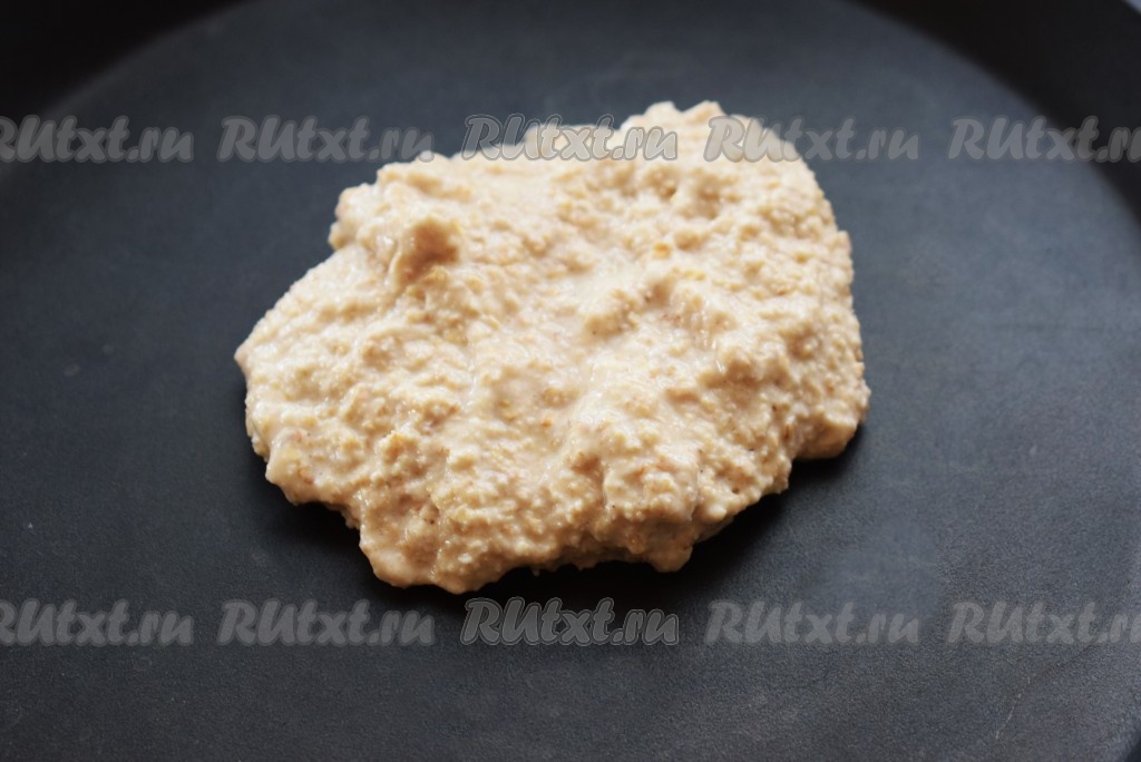Сковороду с антипригарным покрытием разогреваем на огне (масло не добавляем), затем уменьшаем огонь до среднего и выкладываем в центр сковороды овсяную массу.