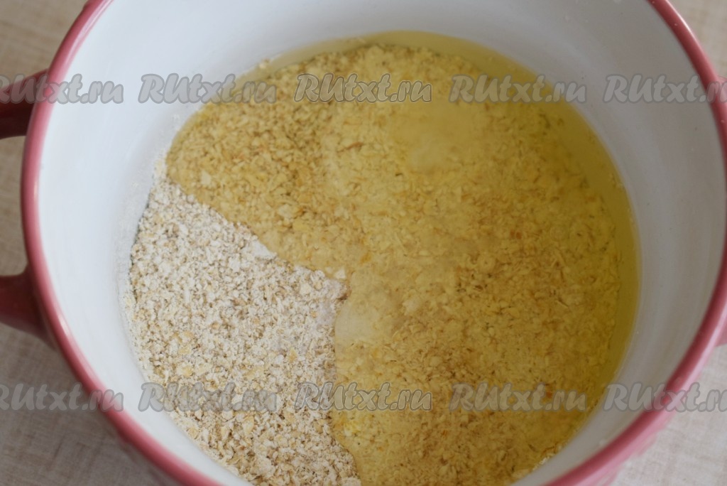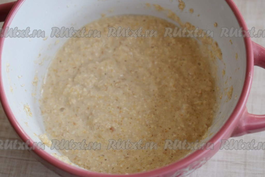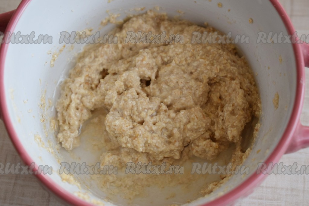 Тщательно перемешиваем получившуюся овсяную массу, затем вливаем воду (или молоко).