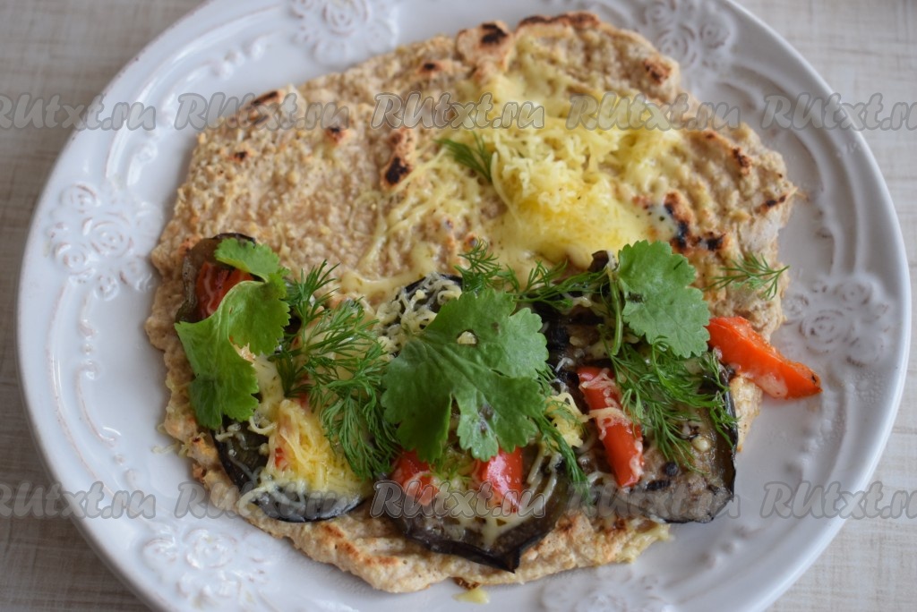 Ставим овсяноблин в микроволновую печь на 30 секунд (для расплавления сыра). Достаем овсяноблинчик с овощами из микроволновки и кладем на начинку зелень.