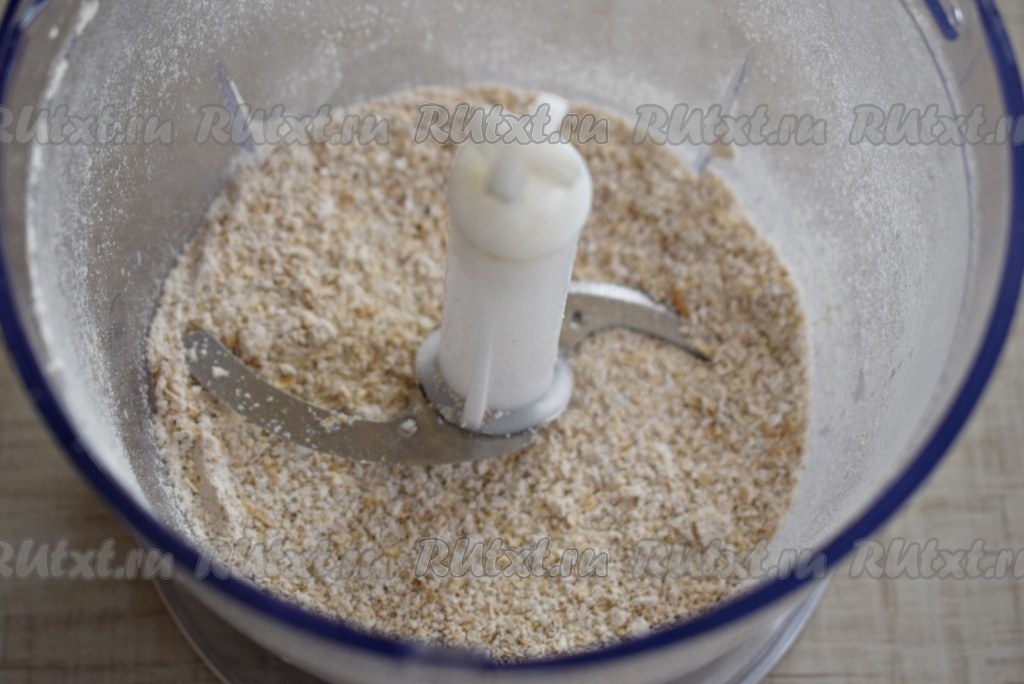 Измельчаем хлопья в измельчителе. Измельченные хлопья станут похожи на муку крупного помола.