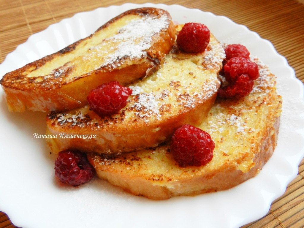 Ароматные гренки на завтрак готовы, посыпаем их сахарной пудрой и украшаем ягодами малины.