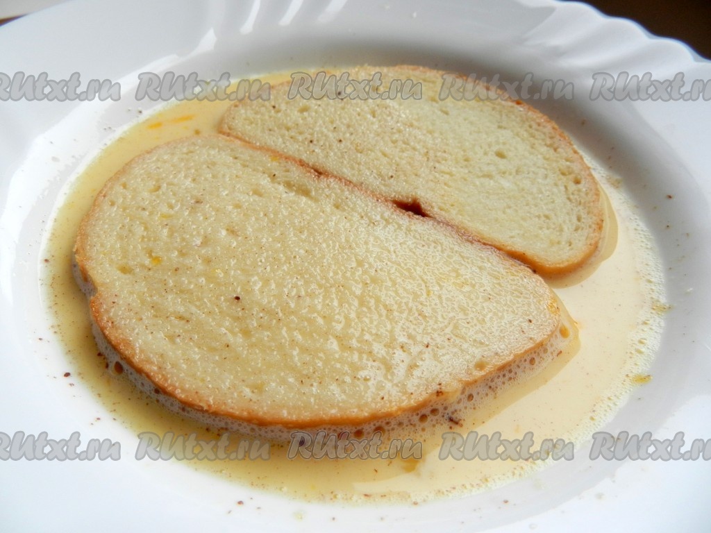 В молочно-яичную смесь положить ломтики батона, оставить на несколько минут, периодически переворачивая, чтобы хлеб пропитался.