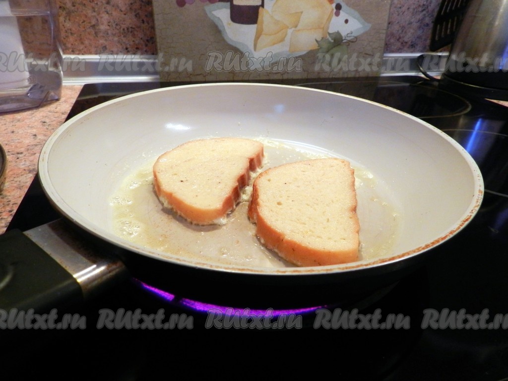 В сковороде разогреть сливочное масло и обжарить гренки сначала с одной стороны,