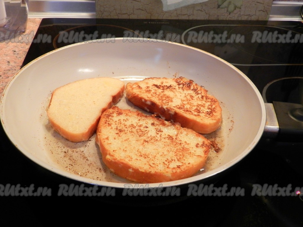 Перевернуть гренку на другую сторону. Обжариваются гренки из батона с корицей очень быстро.