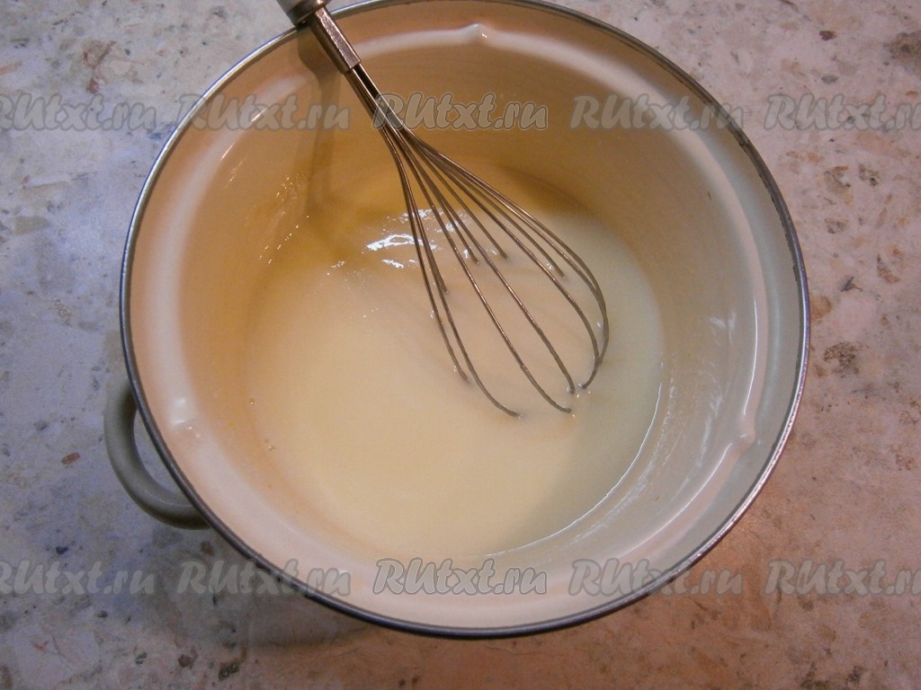Поместить кастрюлю на медленный огонь и при постоянном помешивании довести смесь до кипения. Варить на маленьком огне 1-2 минуты. Получится заварная масса, похожая на жидкий кисель.