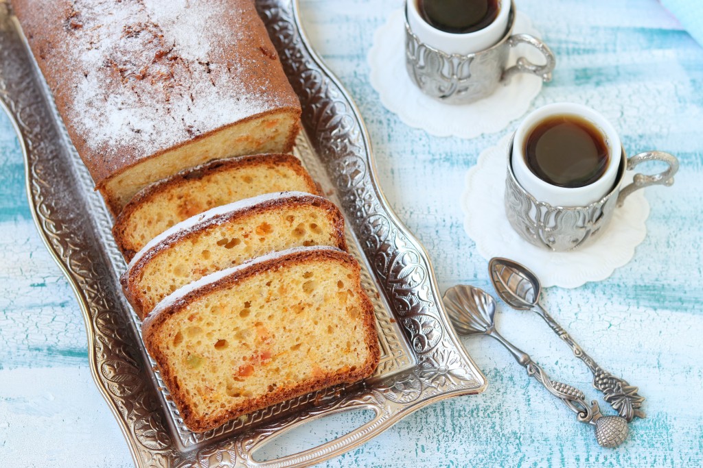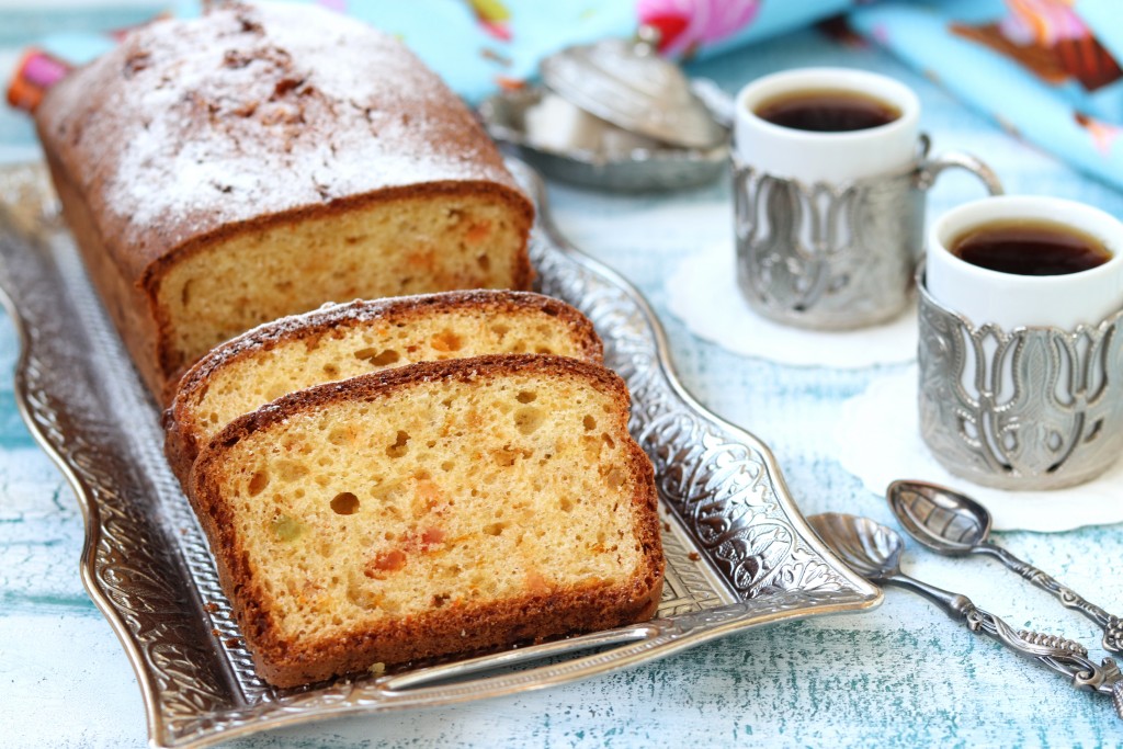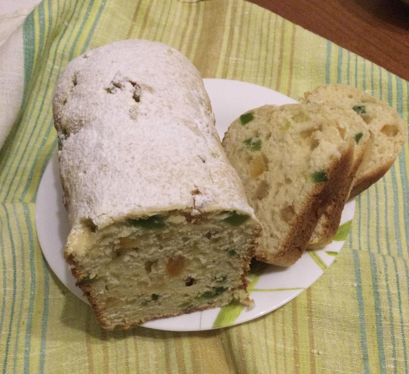 Очень вкусный творожный кекс с цукатами посыпаем сахарной пудрой, нарезаем на порционные кусочки и подаём к столу.