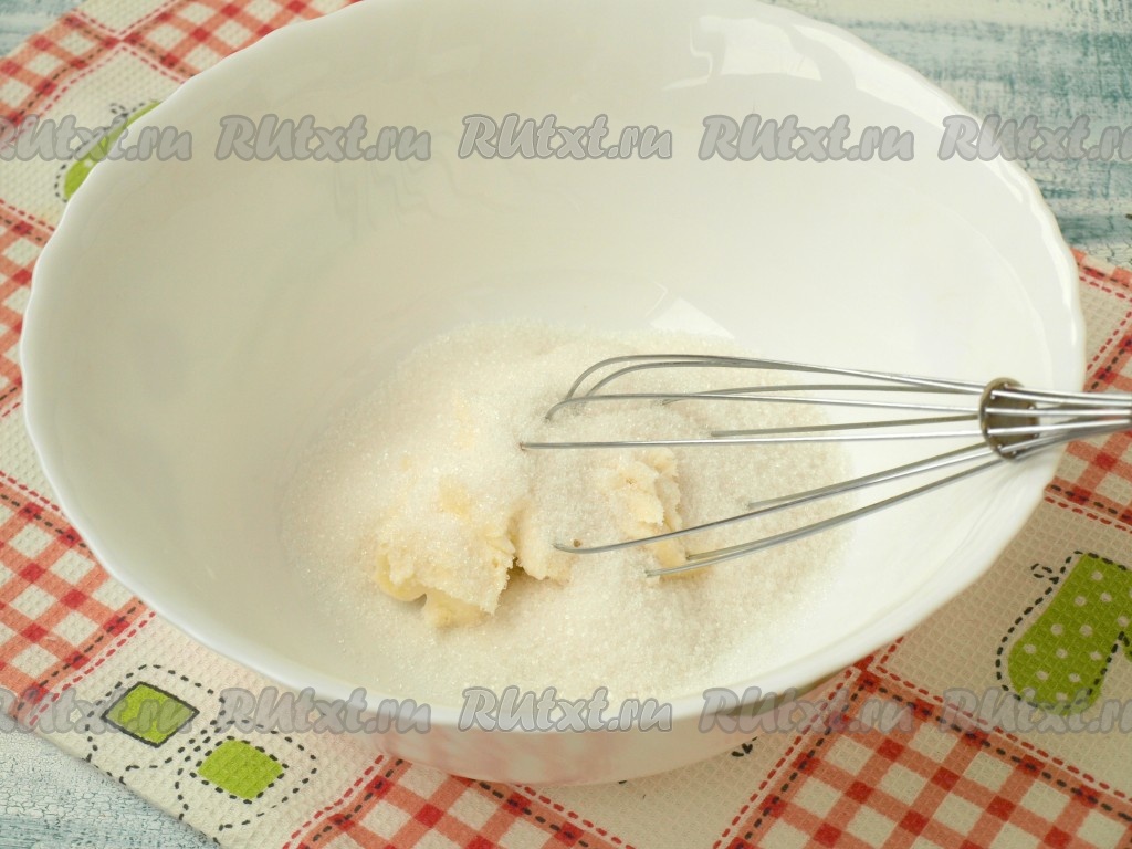 Мягкое сливочное масло поместить в миску, добавить сахар и хорошо растереть.