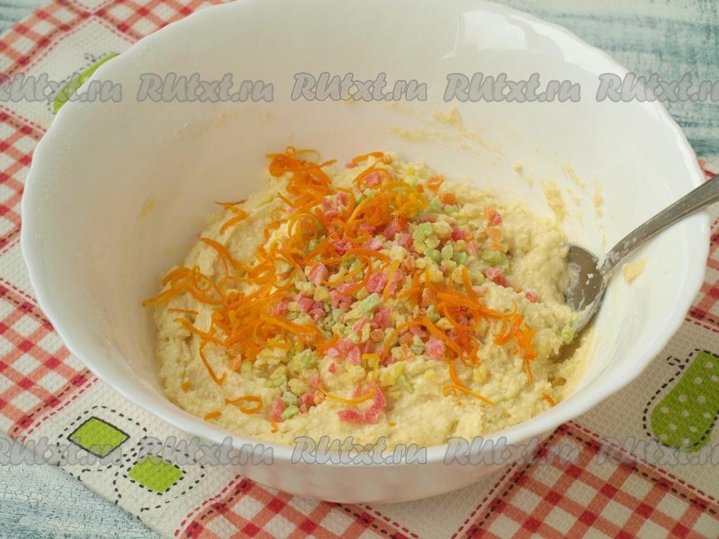 Тесто для кекса получится густым. Добавляем в него цукаты и, по желанию, апельсиновую цедру (у меня цедра от одного апельсина). Цукаты необходимо нарезать небольшими кусочками, у меня были - мелкие ананасовые.