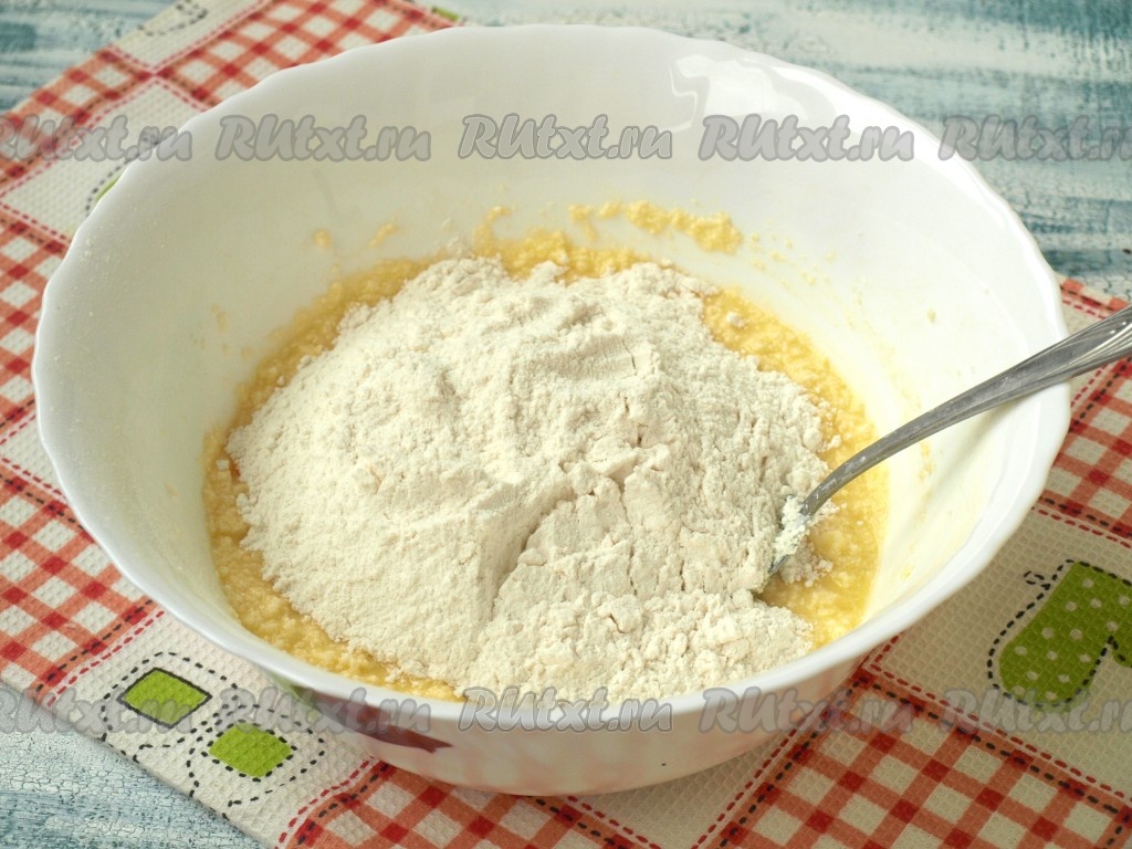 Далее добавляем соду, гашеную уксусом, и просеиваем муку. Размешиваем тесто ложкой.
