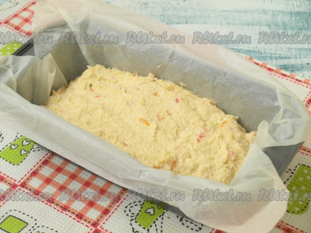 Застелить пергаментом форму для выпечки, выложить тесто и разровнять лопаткой.