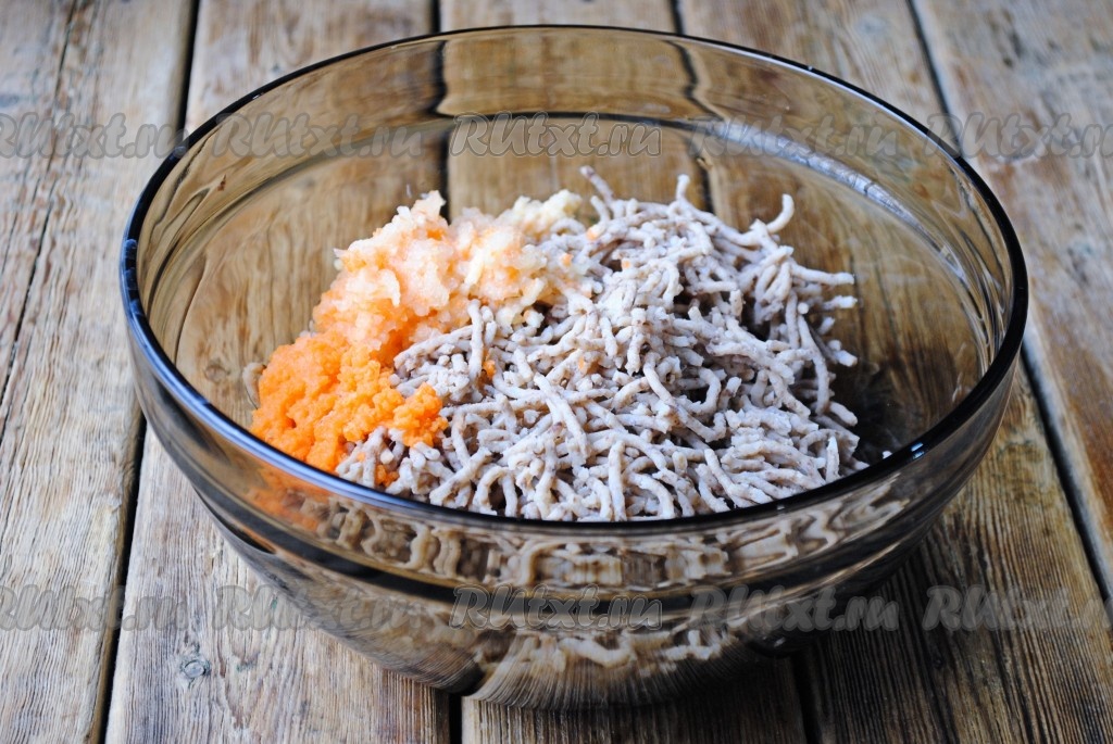 Очищенные морковку и лук тоже пропустить через мясорубку и выложить к гречке.