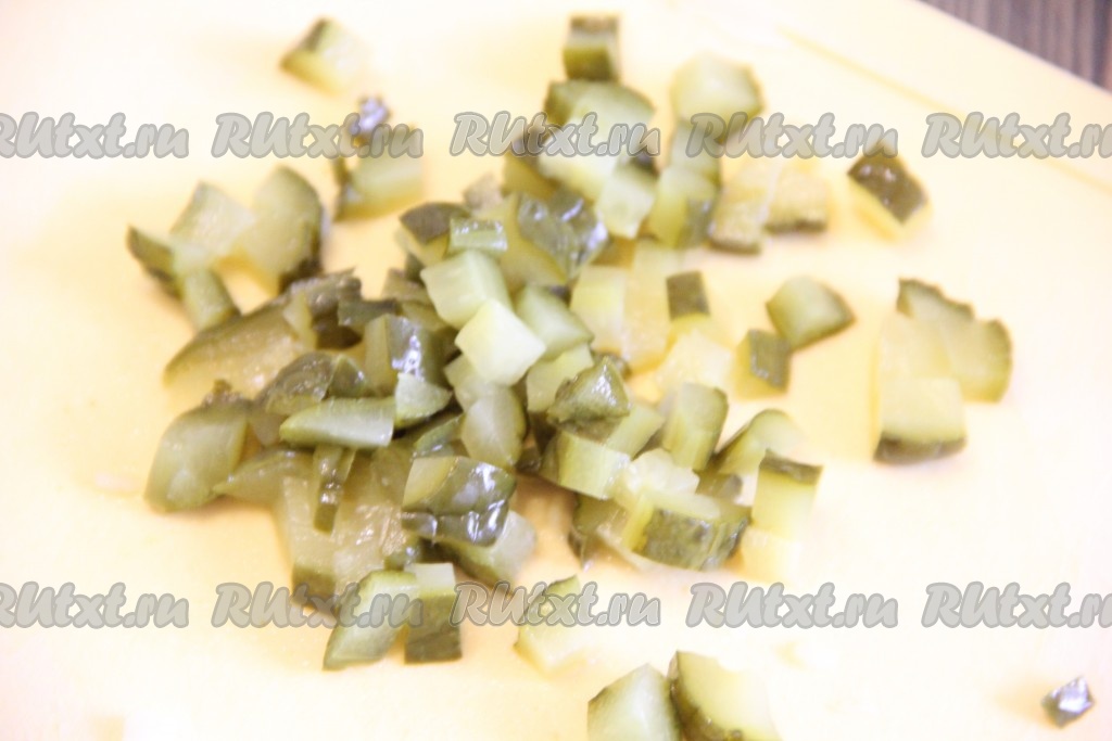 Маринованные огурчики мелко нарезать и выложить на лук.