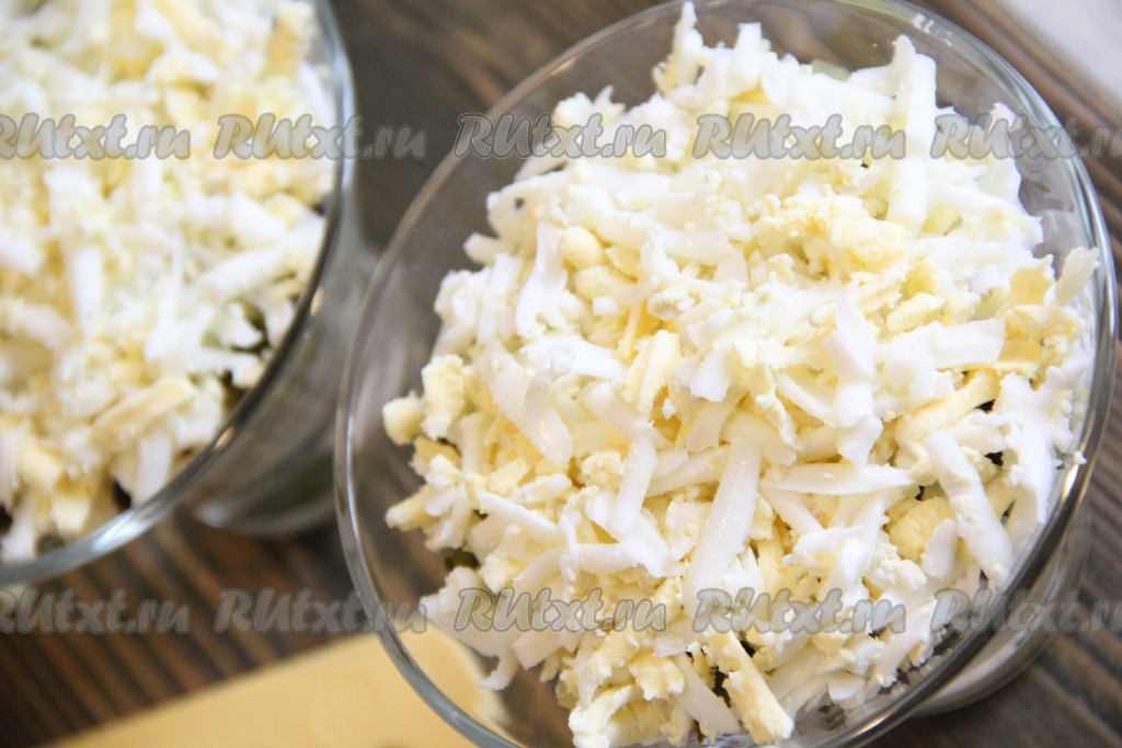 Яйца, натертые на крупной тёрке, выложить поверх огурцов и сделать сеточку из майонеза.