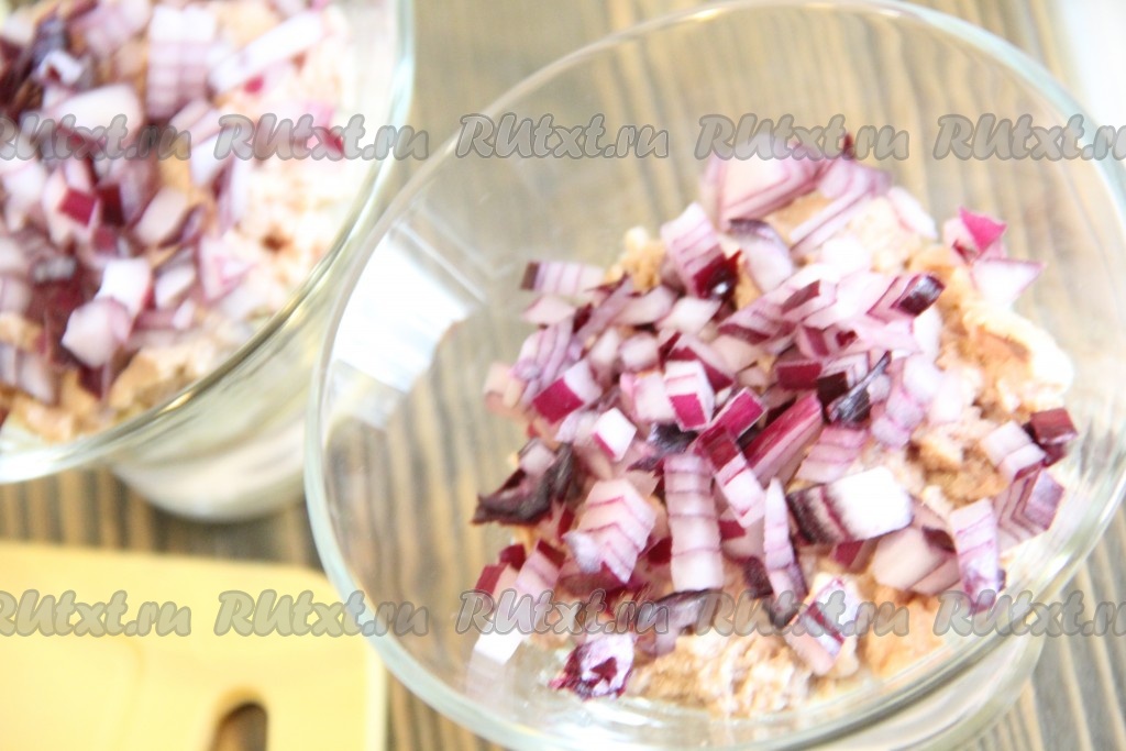 Выложить лук поверх печени трески, сделать сеточку из майонеза.
