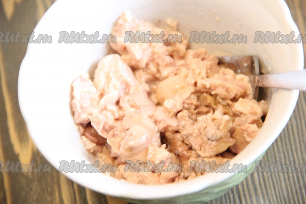 Печень трески аккуратно откинуть на дуршлаг (пусть излишки масла стекут). Затем вилкой размять печень, но не мелко.