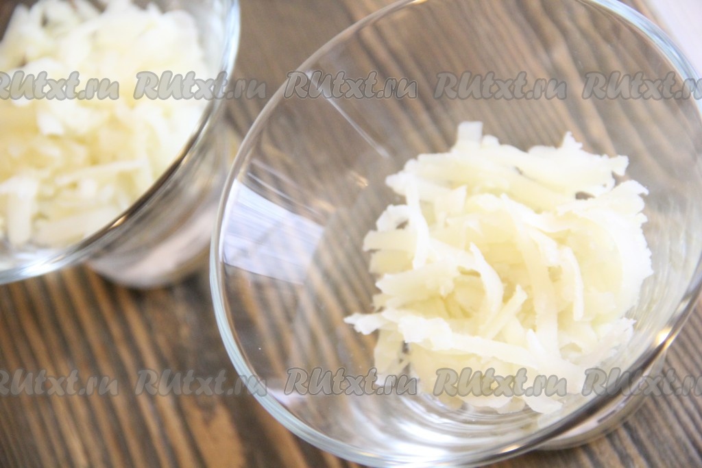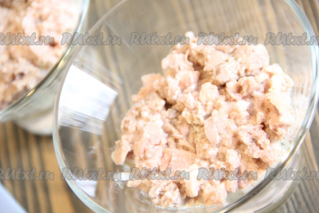 Выложить натёртый картофель на дно салатников или на плоскую тарелку. Немного посолить и смазать майонезом.