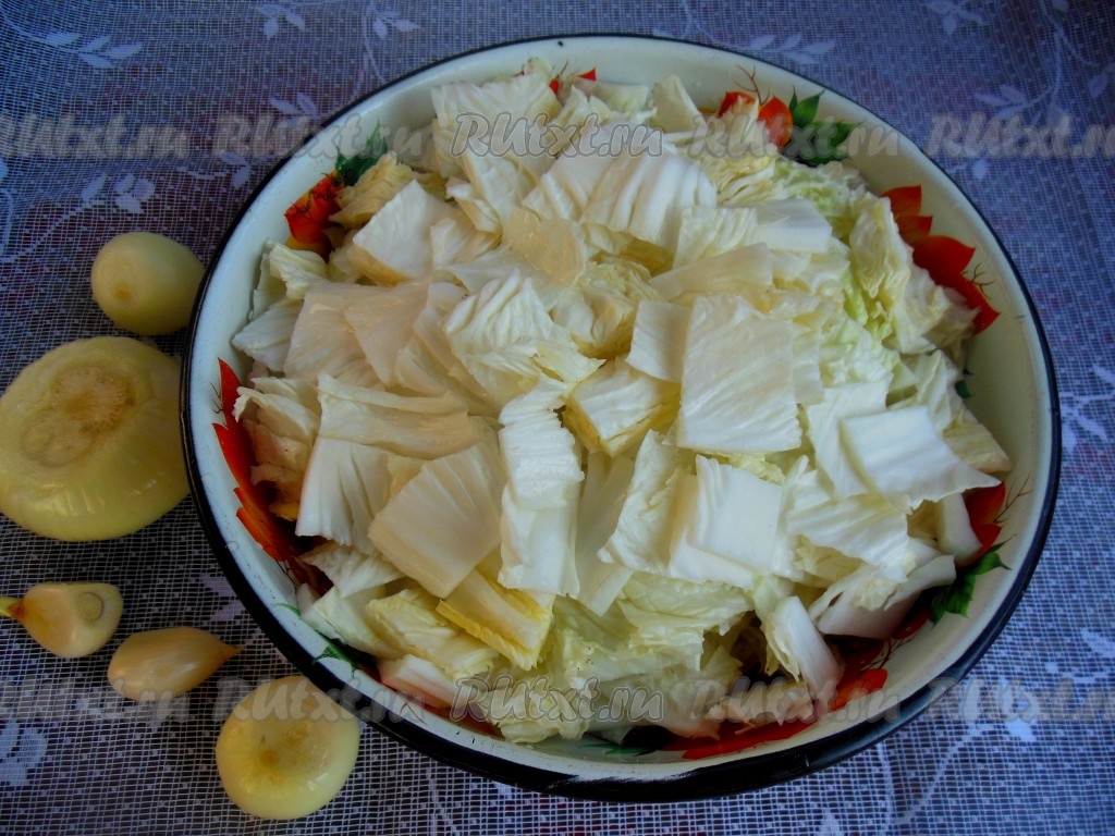 Морковку, чеснок и лук очистите. Репчатый лук нарежьте полукольцами, морковь натрите на терке, чеснок измельчите при помощи ножа, выложите к нарезанной пекинской капусте и перемешайте.