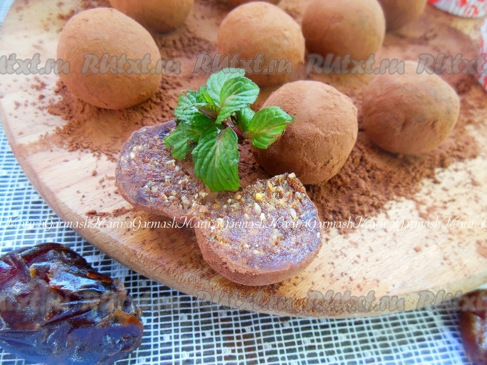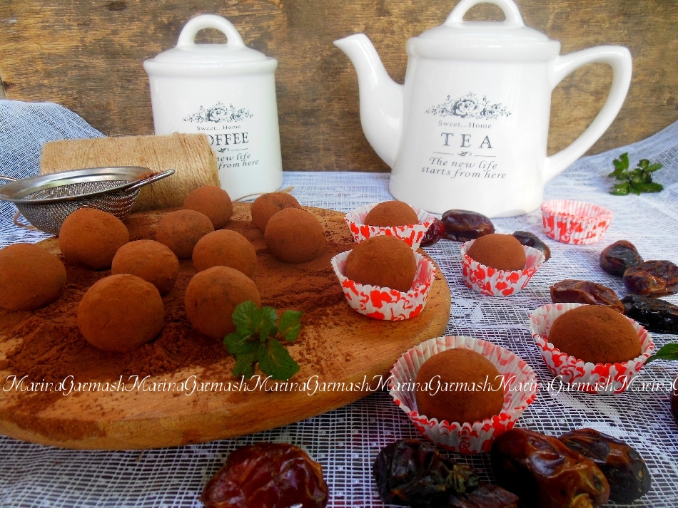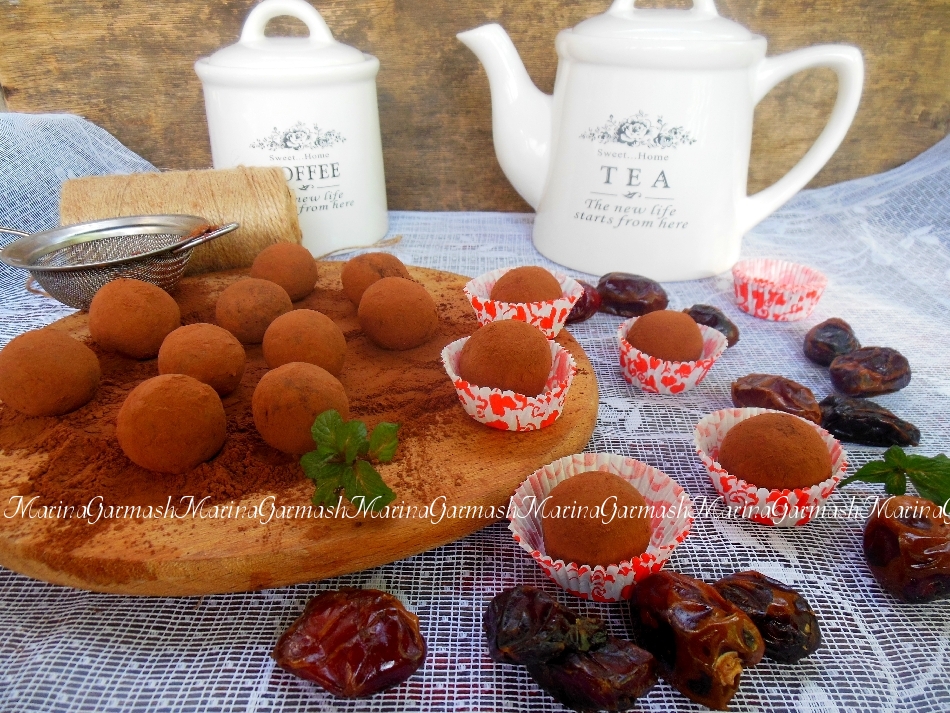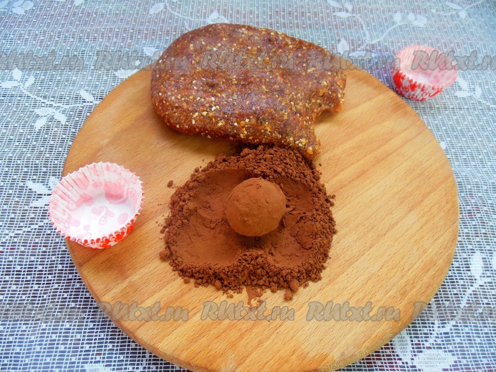 Обваляйте каждый шарик в какао-порошке. Уберите готовые конфеты из фиников в холодильник на 30-40 минут. Из указанного количества ингредиентов у меня получилась 15 небольших конфеток.