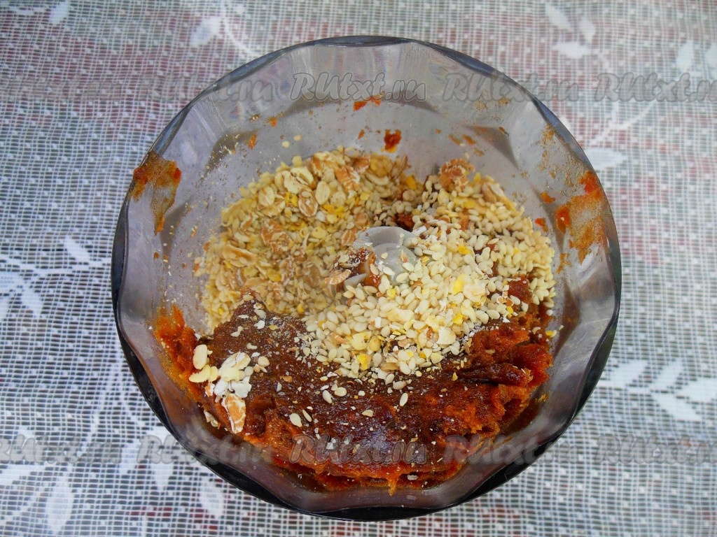 В чашу блендера к измельченным финикам добавьте подсушенный кунжут и овсяные хлопья. Измельчите массу блендером.