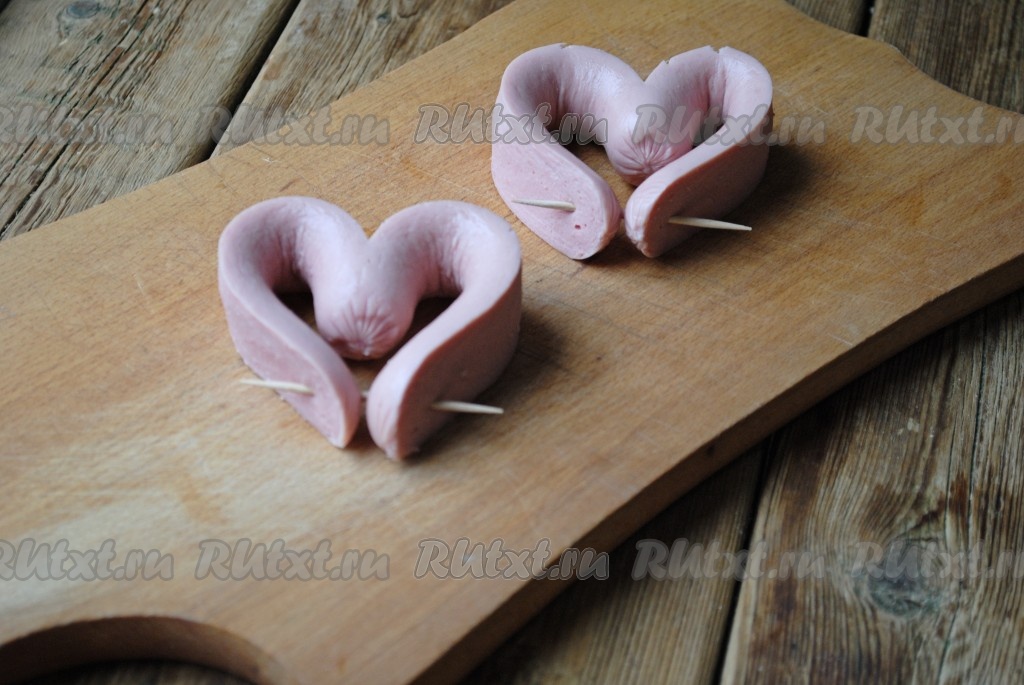 Изогнуть сосиски в виде сердца, скрепить зубочисткой.