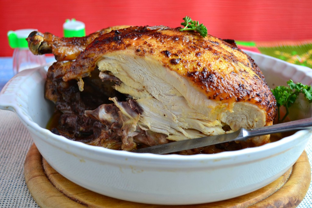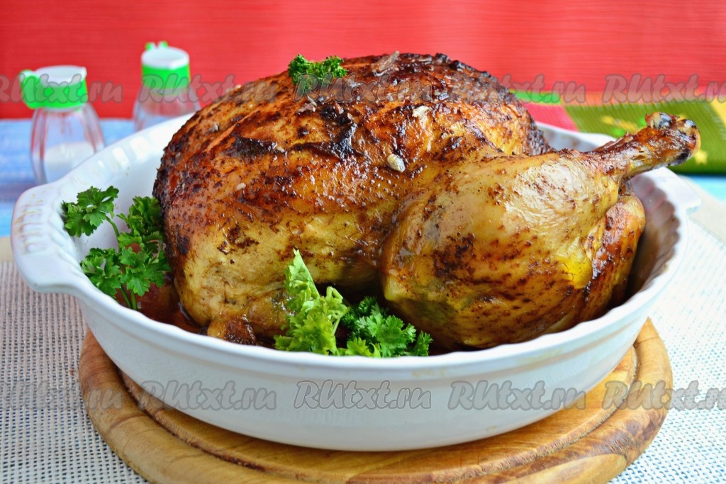 Противень отправить в разогретую до 190 градусов духовку на 2 часа. Курица, приготовленная в соевом соусе в духовке целиком, получается шикарной: вкусной, мягкой, нежной и очень ароматной. Подайте курочку к столу!