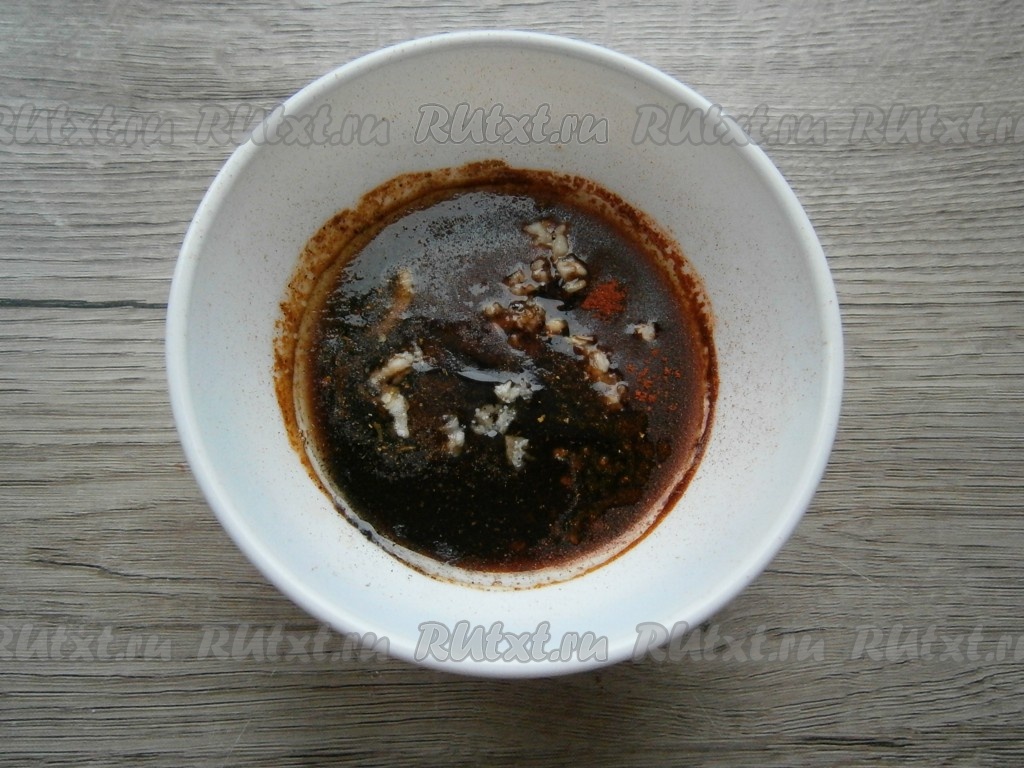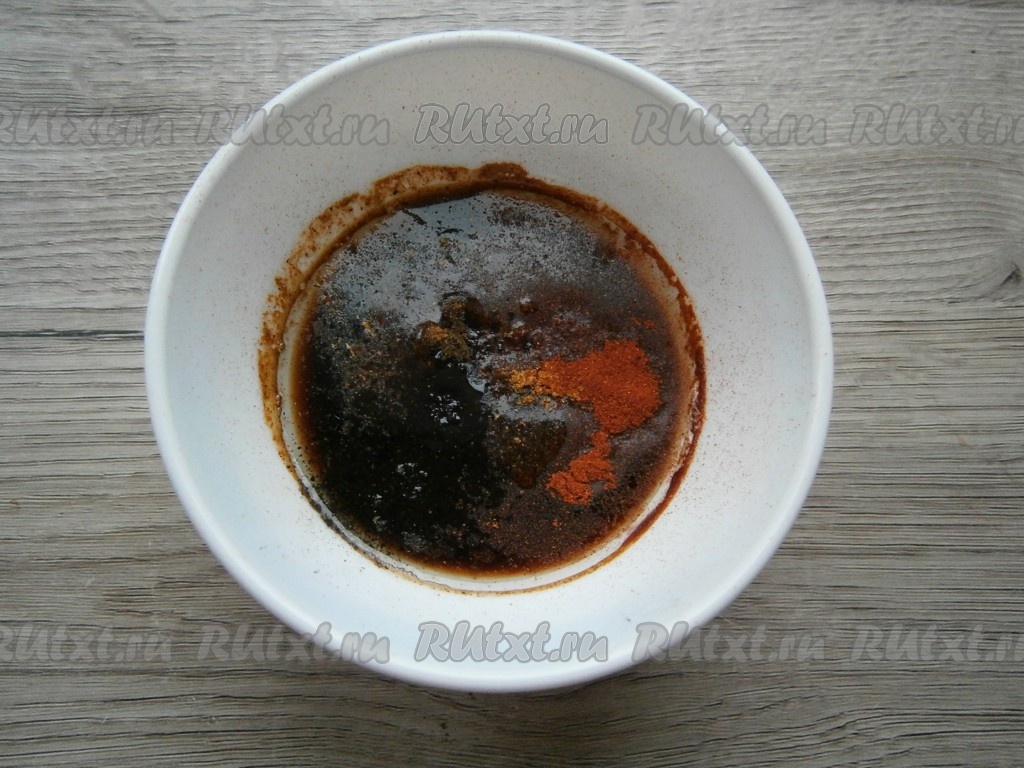 Приготовить соус: добавить к соевому соусу растительное масло, перец черный свежемолотый, специи или приправу для курицы, паприку.