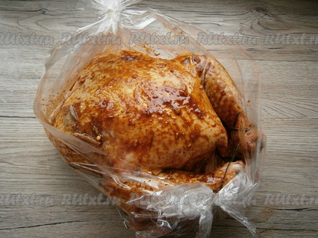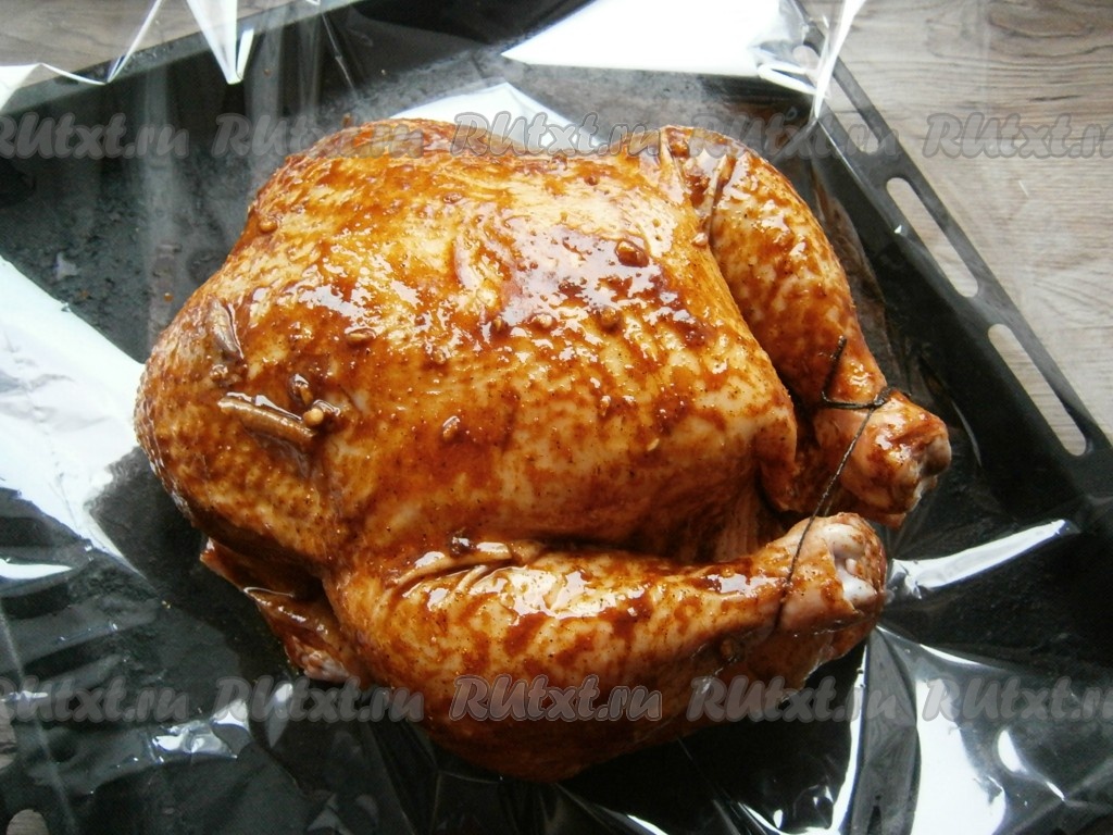 Рукав для запекания, разрезанный с одной стороны, или лист фольги, сложенный вдвое, разложить на противень, поместить туда курицу. Ножки курицы связать нитью.