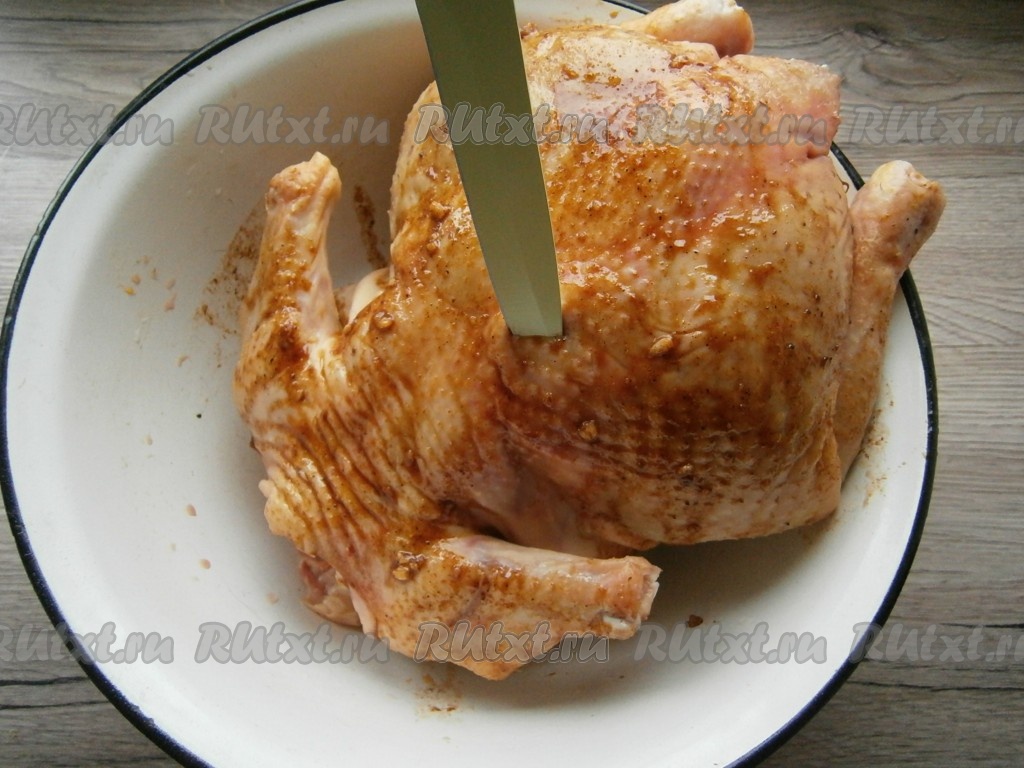 Курицу немного натереть солью, наколоть всю ножом (как на фото) и смазать подготовленным соусом внутри и снаружи. Оставить курицу на пару часов в прохладном месте.