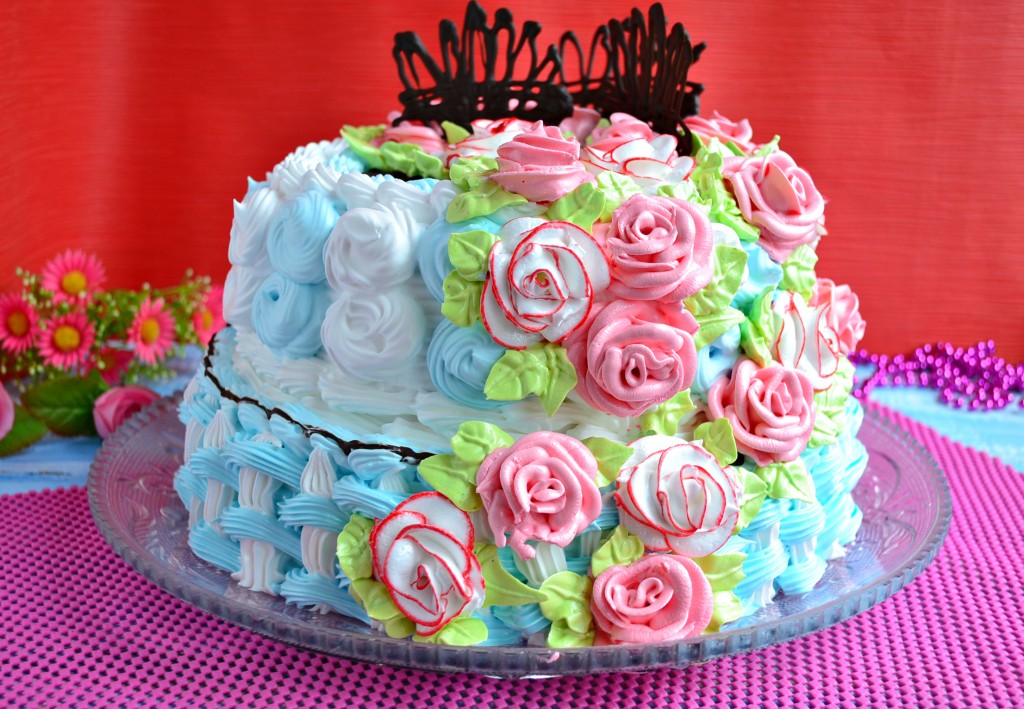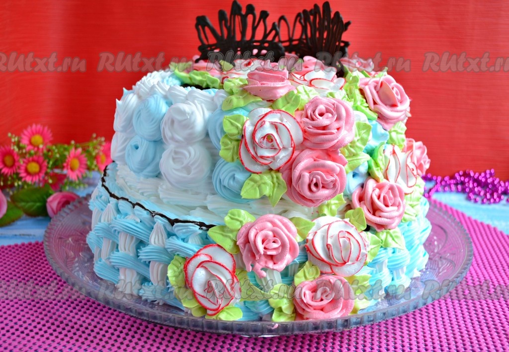 Теперь этот замечательный торт можно украсить на свое усмотрение. Я готовила этот торт на юбилей женщине, поэтому украсила его розовыми и белыми розами из белкового заварного крема ("мокрое" безе), бока нижнего яруса оформлены в виде корзиночного переплета также из белкового крема (белого и голубого). Бока верхнего яруса я украшала взбитыми сливками (кондитерским кремом) также в бело-голубом тоне. Для цвета крема я использовала гелевые пищевые красители. Также я еще использовала шоколадные украшения, их можно сделать самим: растопить черный шоколад на водяной бане, поместить его в кондитерский пакет, срезать чуть кончик и нарисовать то что вам угодно на листе пергамента, который поместить на досочку, затем переместить все в холодильник до застывания.