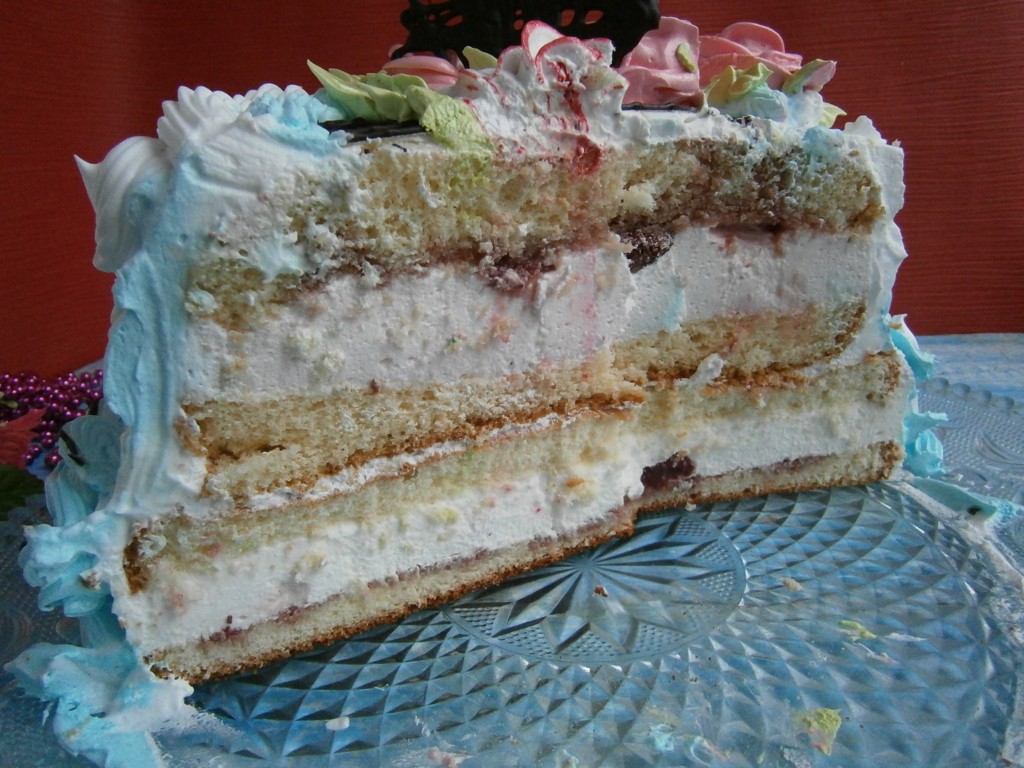 Вот так выглядит в разрезе этот бисквитный торт с суфле. Этот необычайно вкусный, нежный, легкий, воздушный юбилейный торт, приготовленный для женщины, вызвал у гостей шквал восторженных отзывов, очень всем понравился. Попробуйте, готовится торт, конечно, долго, но он того стоит!