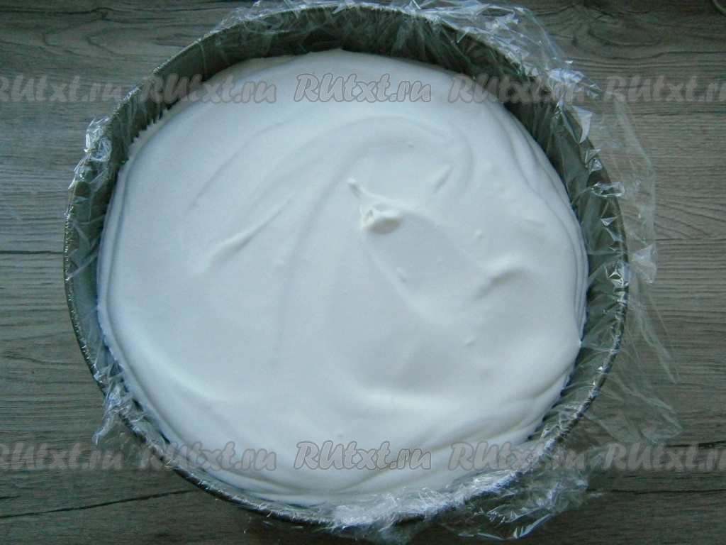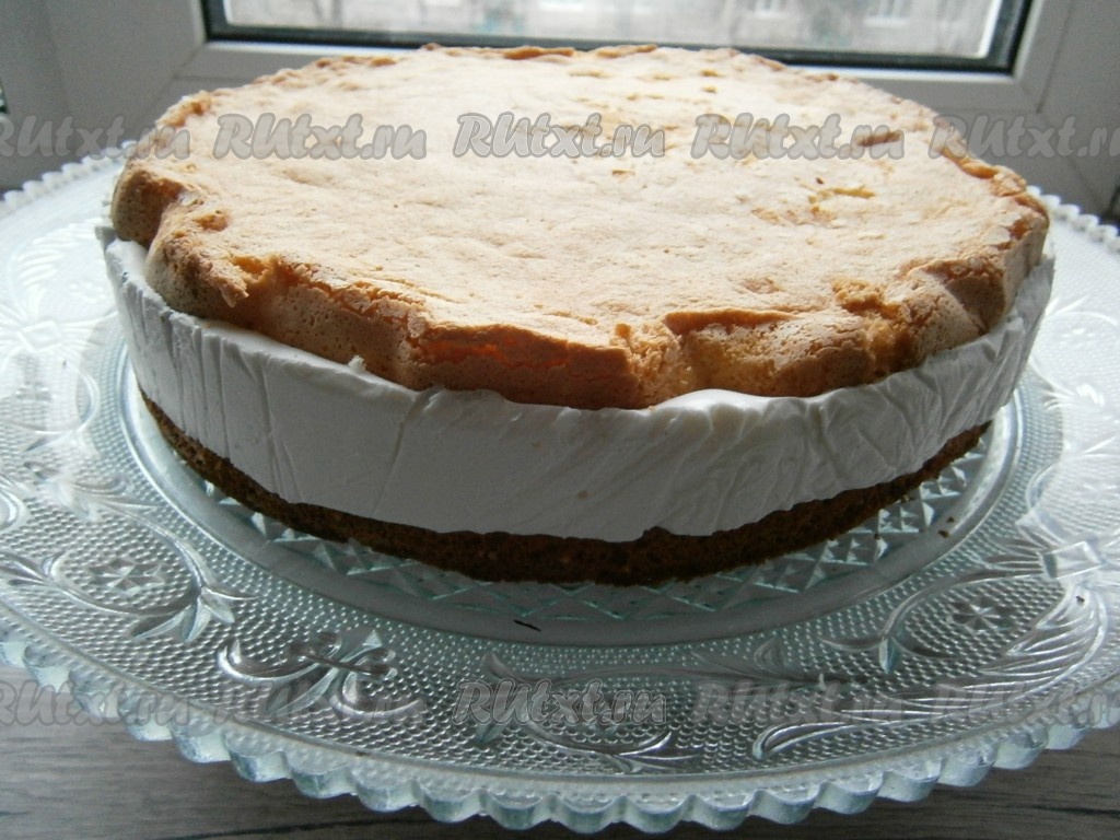 Сверху разместить вторую часть этого бисквита, чуть ее вдавливая в суфлейную смесь. Отправить бисквит в форме в морозилку на 30-40 минут, а затем переставить в холодильник на 7-8 часов.