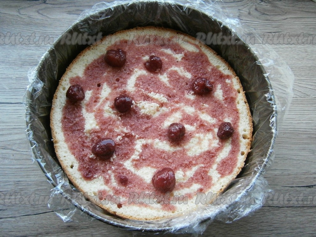 Нижнюю часть большого (первого) бисквита поместить в ту же форму, в которой он выпекался, предварительно тщательно застелив её пищевой пленкой. Пропитать этот бисквит джемом, смешанным с коньяком (я использовала джем с ягодами).